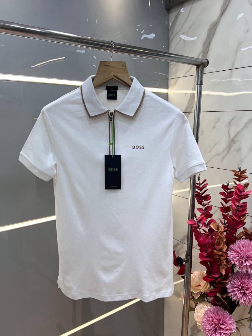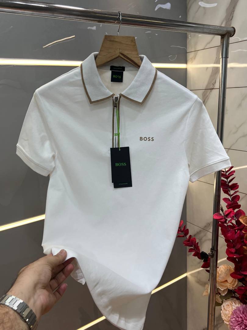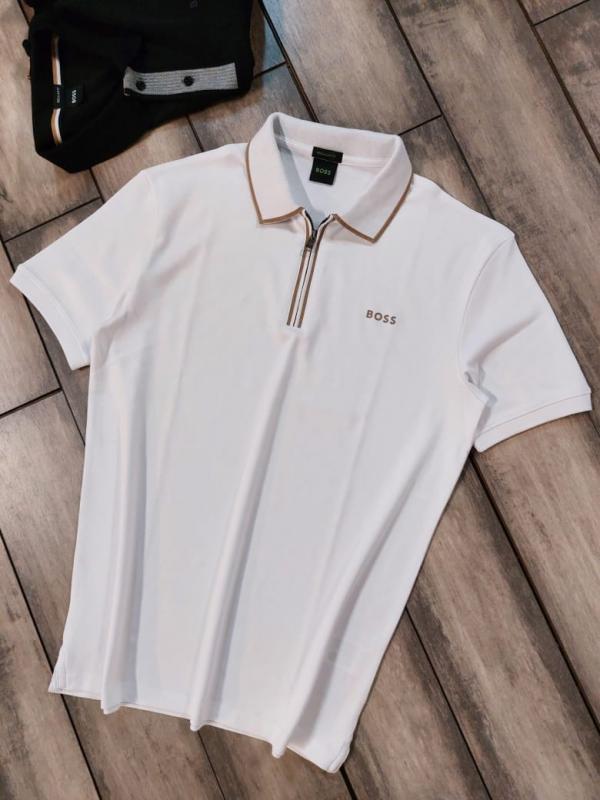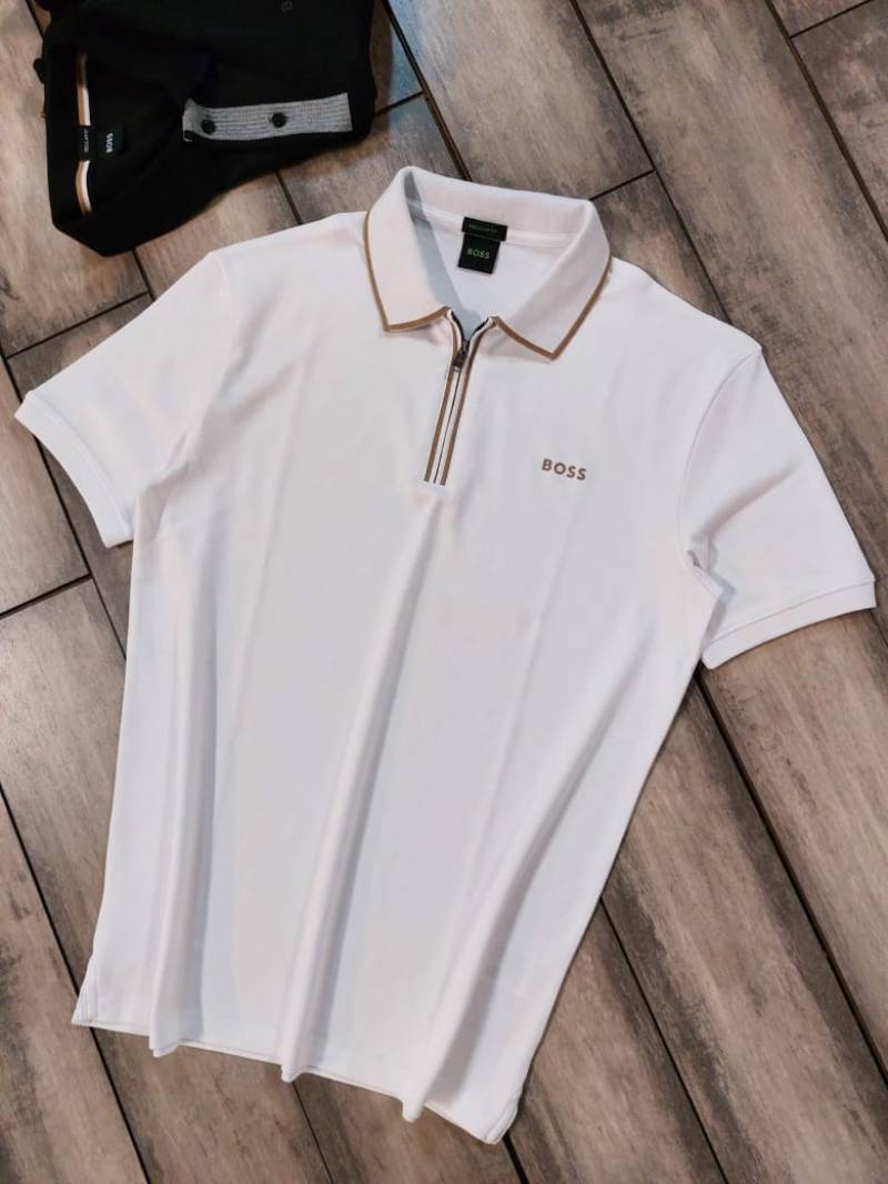 Hugo Bos s White Premium 240 gsm interlock compact cotton fabric Polo Tshirt with Collar Design and Emboss Logo Zip Style 3364